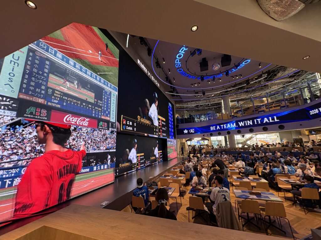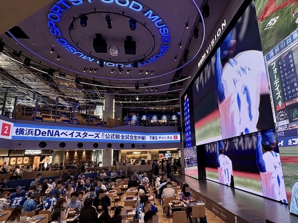 「THE LIVE」と名付けられたこのエリア。見上げるほどの巨大スクリーンには、ベイスターズ戦が映し出され、ファンたちの熱気に包まれています。