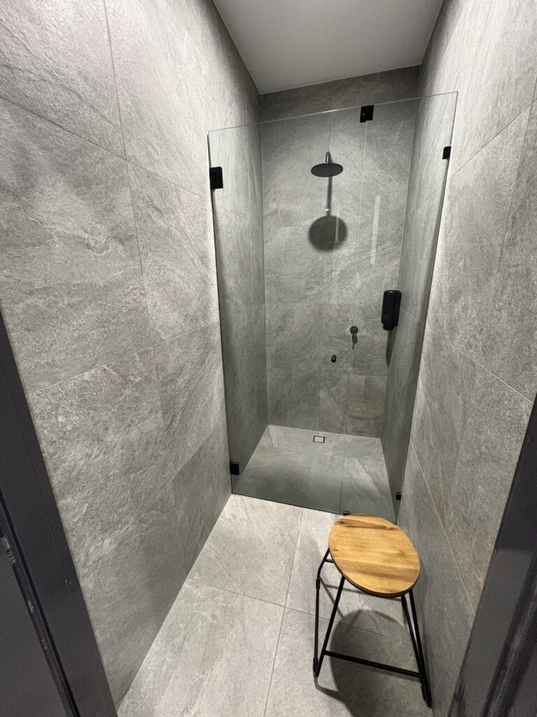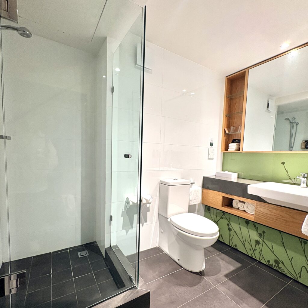特筆すべきは水回りの清潔感。シャワーブースはガラス張りで仕切られており、使い勝手も抜群でした。アメニティも一通り揃っており、ストレスフリーに過ごせます。
