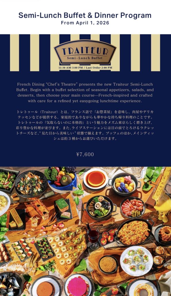 2026年4月から始まったランチブッフェ「TRAITEUR(トレトゥール)」の魅力は、何といっても選りすぐりの前菜とデザートがブッフェスタイルで楽しめること。