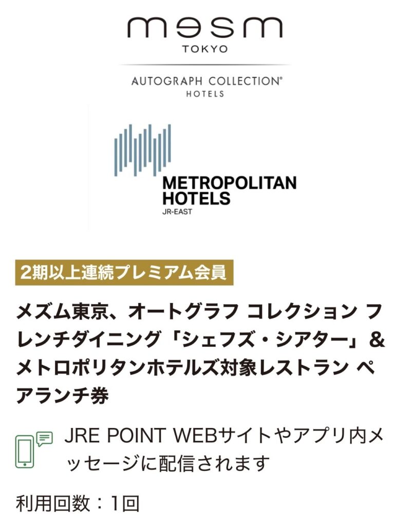 JR東日本グループの共通ポイントサービス「JRE POINT」には、利用状況に応じたステージ制がありますが、プレミアムステージになると貰える特典の中に、このメズム東京のペアランチ招待券が含まれているんです!