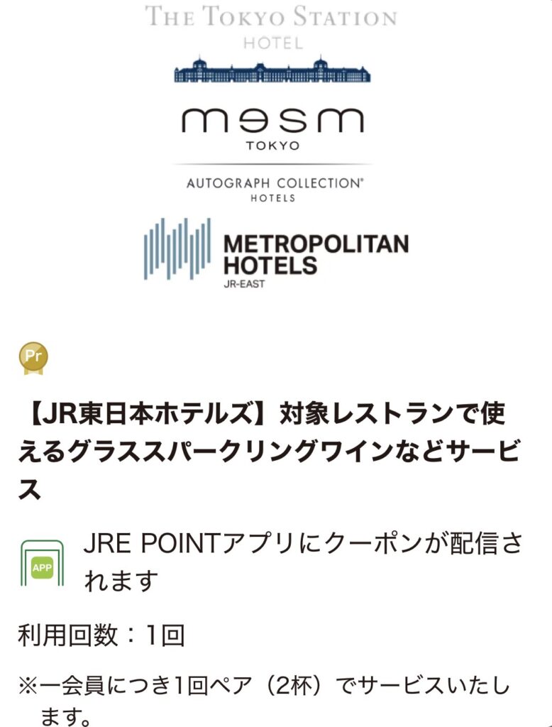 ちなみに、実はJRE POINTのプレミアムステージ会員の特典を併用することで、JR東日本ホテルズ直営レストランでの「グラススパークリングワイン」のサービスも受けられるんです。