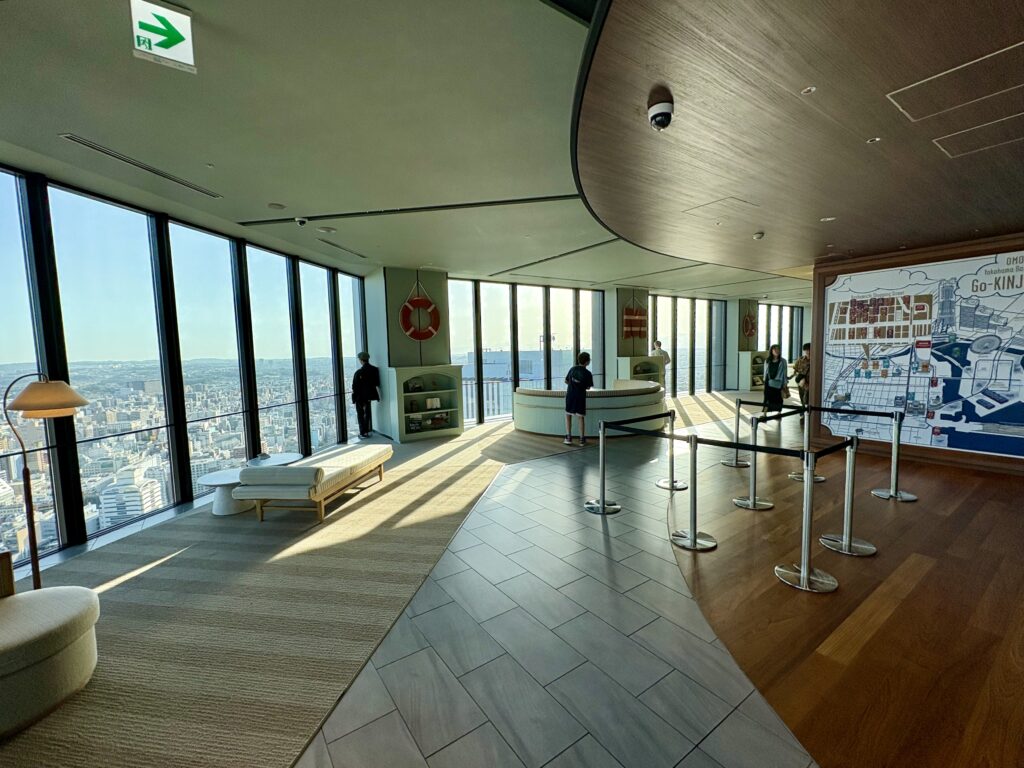 実はこのビルの46階、星野リゾートのホテル「OMO5横浜馬車道」のフロントロビーになっていて、誰でも無料で入れる絶景スポットがあるんです!