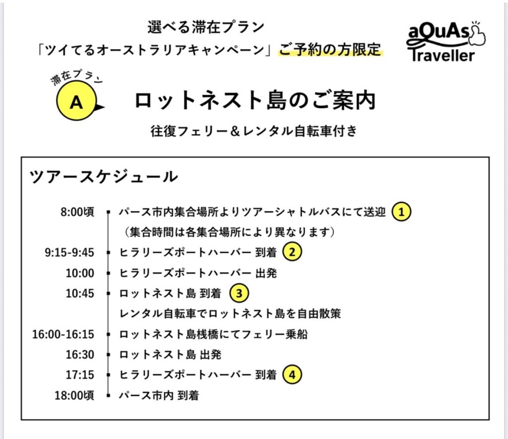 いくつかある中から選んだのは、「プランA:ロットネスト島 往復フェリー&レンタル自転車付き」!