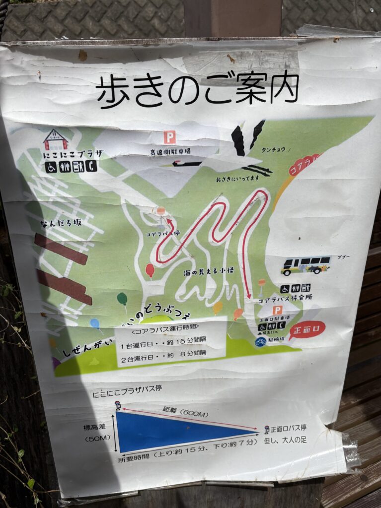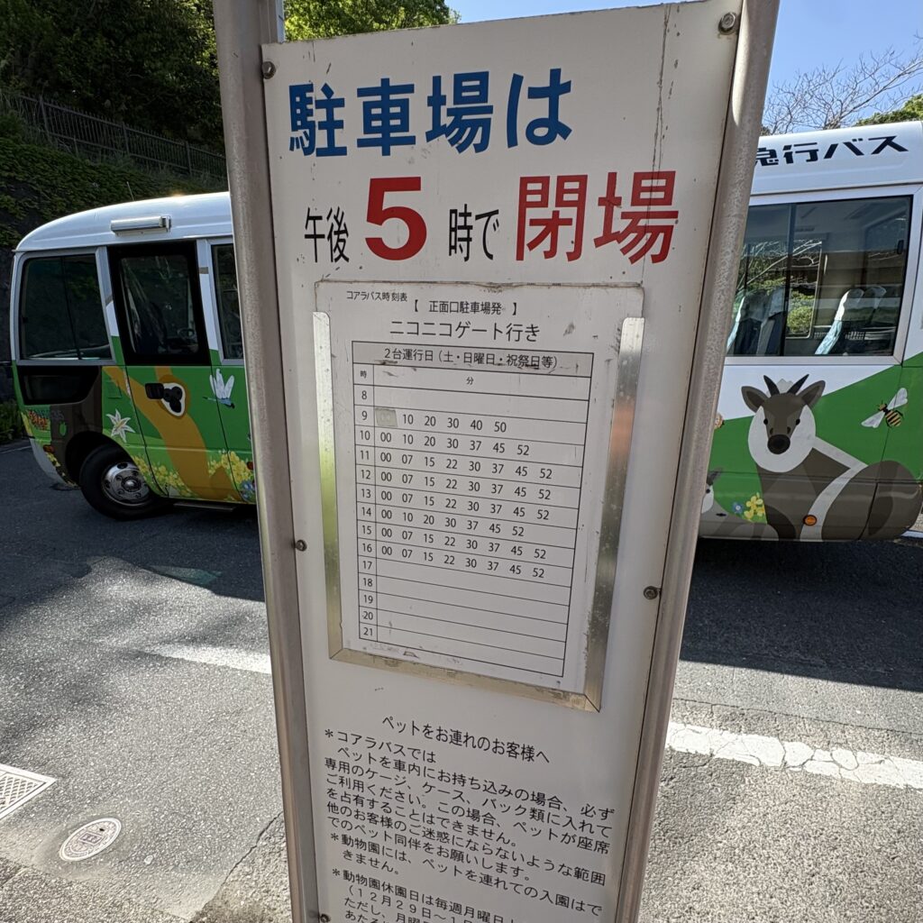山の下の正面口の駐車場からは、可愛い動物たちが描かれたコアラバス(シャトルバス)が10分〜15分おきに運行されているので安心して移動できます🚌