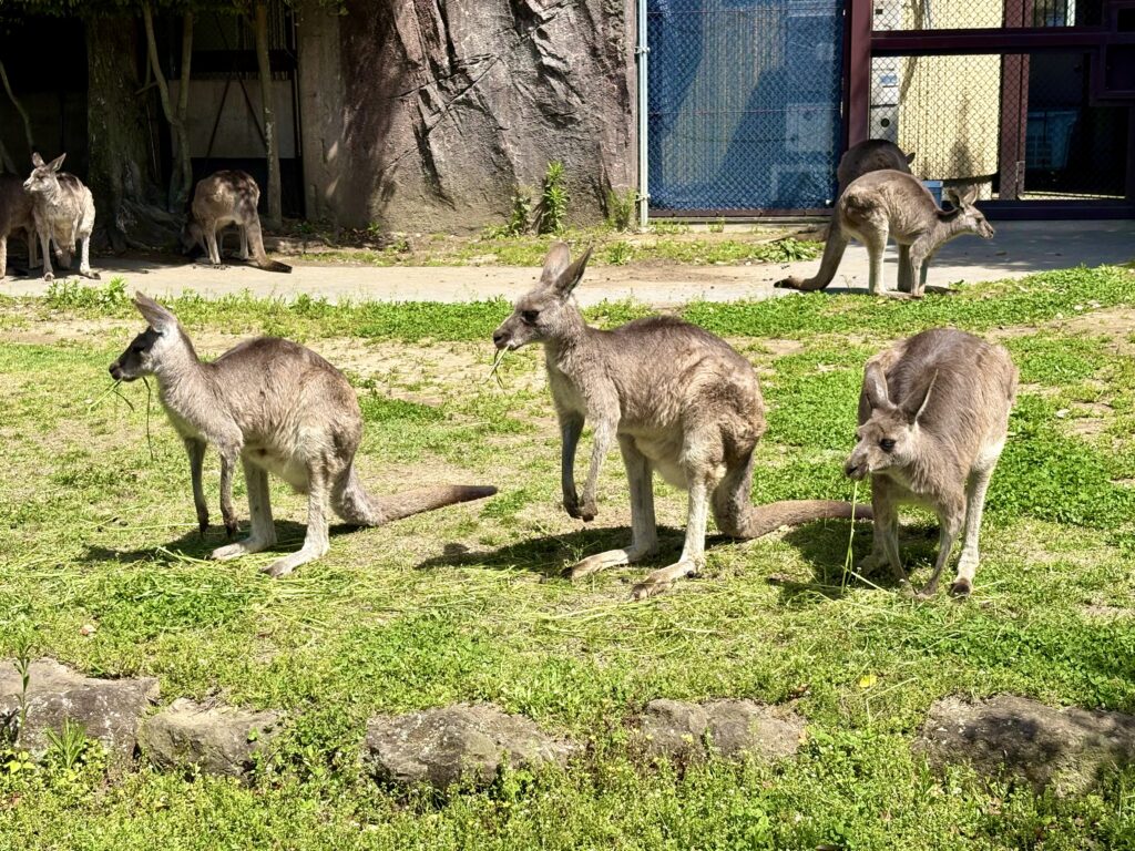 目の前を横切ったり、のんびりと草を食べたり、体を掻いたりする彼らの日常を、柵なしで体感できる貴重なエリアです🦘