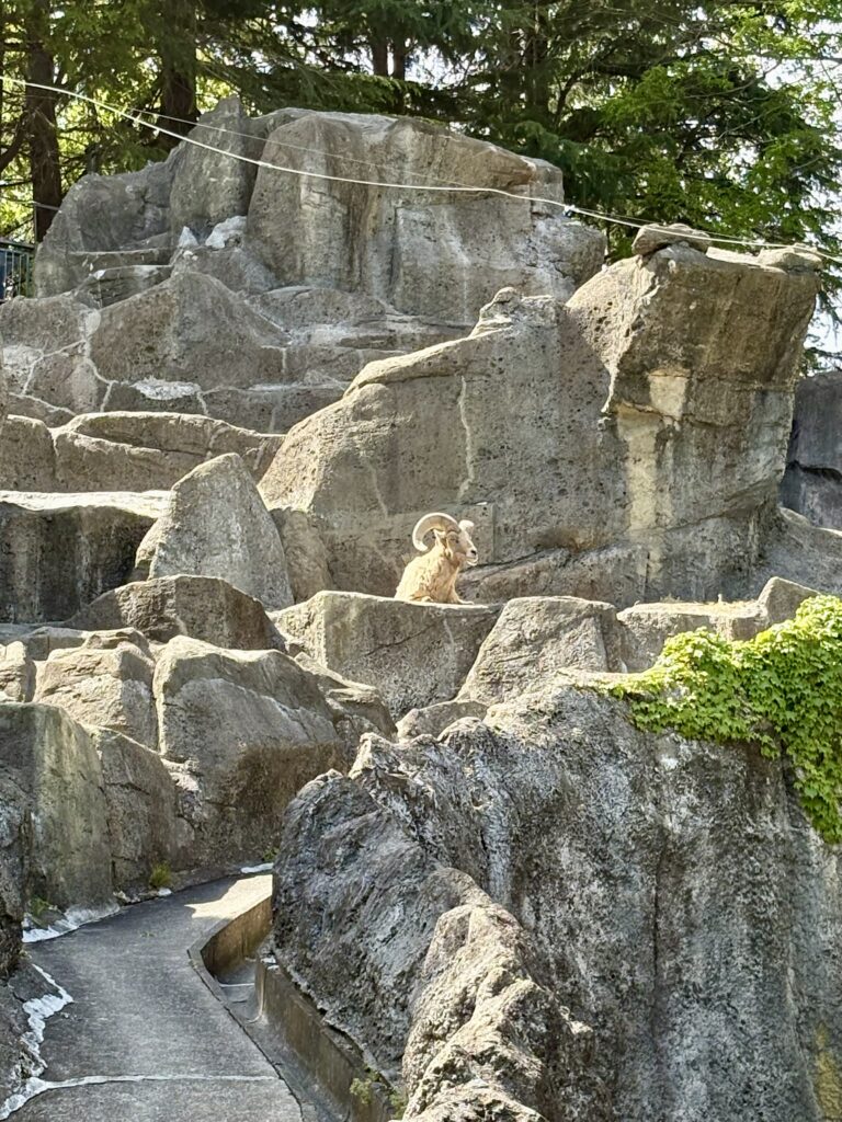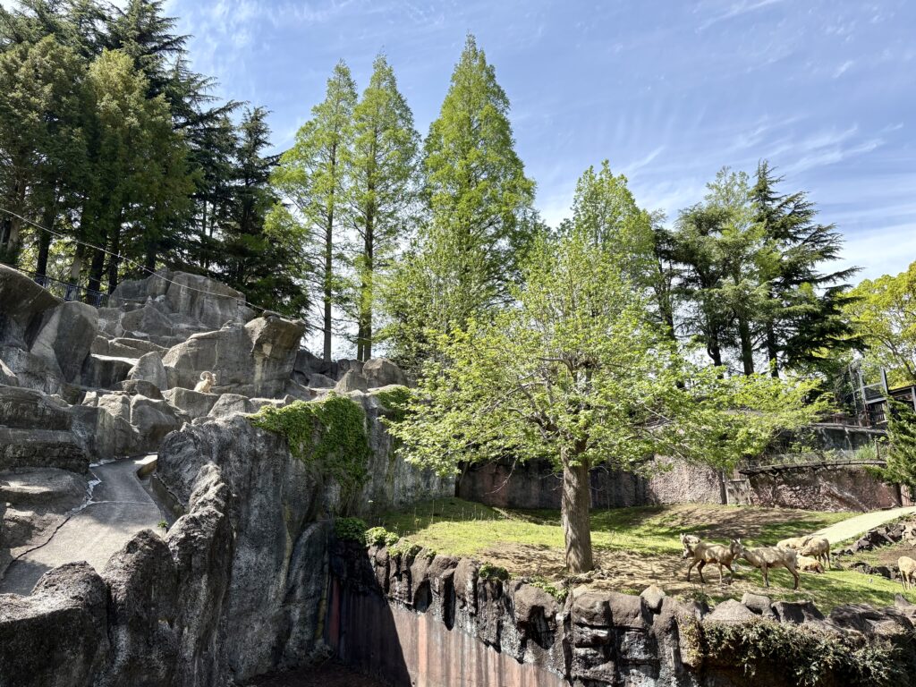 彼らの展示場は、なんと巨大な岩山!断崖絶壁を模したこのエリアで、岩の頂上にちょこんと佇む姿は、まるで山岳地帯の王者のよう。